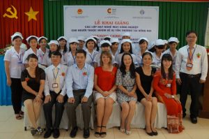 Lãnh đạo GDVT, AECID và THPT Nguyễn Bỉnh Khiêm chụp hình lưu niệm cùng các học viên lớp May công nghiệp