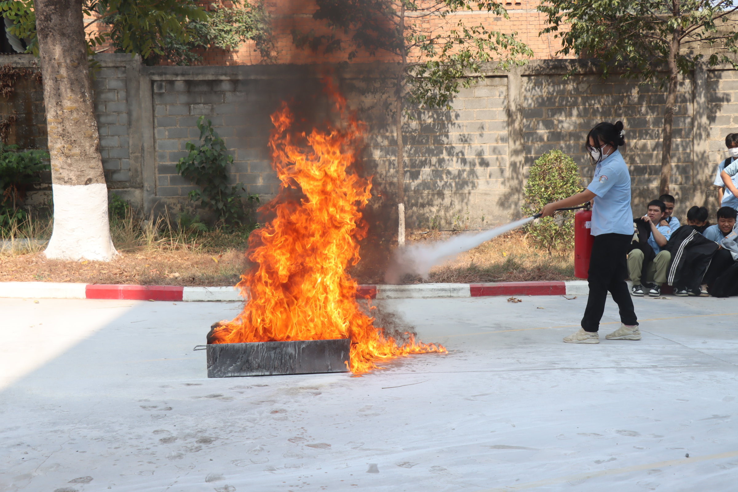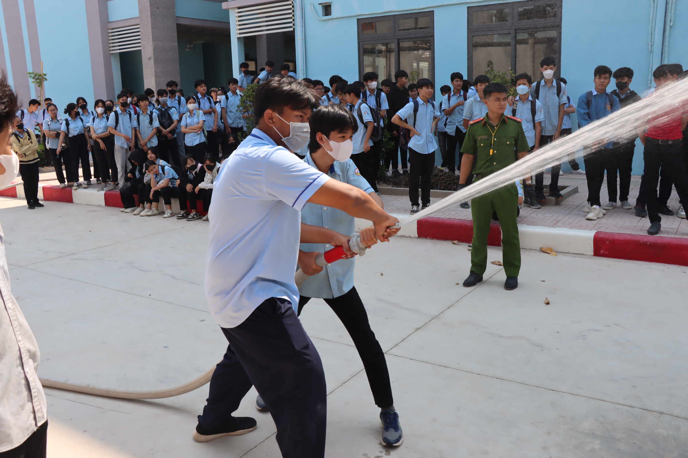 Phần thực hành diễn ra trong không gian rộng lớn của Trường. Học sinh sinh viên đã có cơ hội trải nghiệm việc sử dụng các thiết bị chữa cháy thực tế và thực hiện các kỹ năng dập tắt đám cháy do nguyên nhân thường gặp như rò rỉ khí ga, xăng dầu, thực hành sử dụng vòng chữa cháy. Hoạt động trải nghiệm này sẽ giúp các em rèn luyện kỹ năng và tăng khả năng phản ứng nhanh chóng trong các tình huống cháy, nổ nguy hiểm.