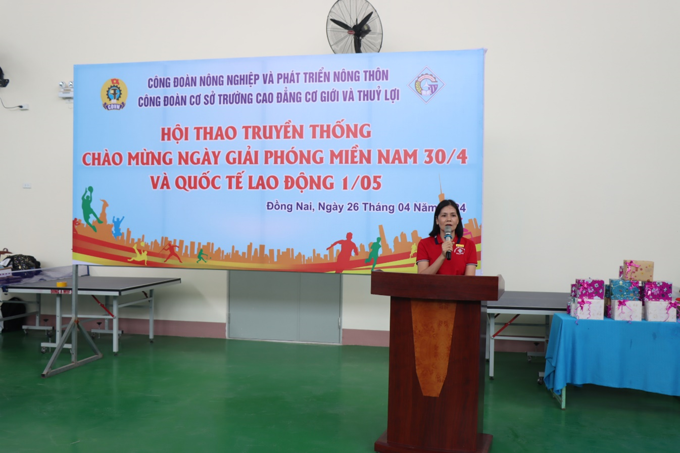 Đồng chí Lê Minh Nguyệt – Chủ tịch công đoàn trường phát biểu tại khai mạc Hội thao