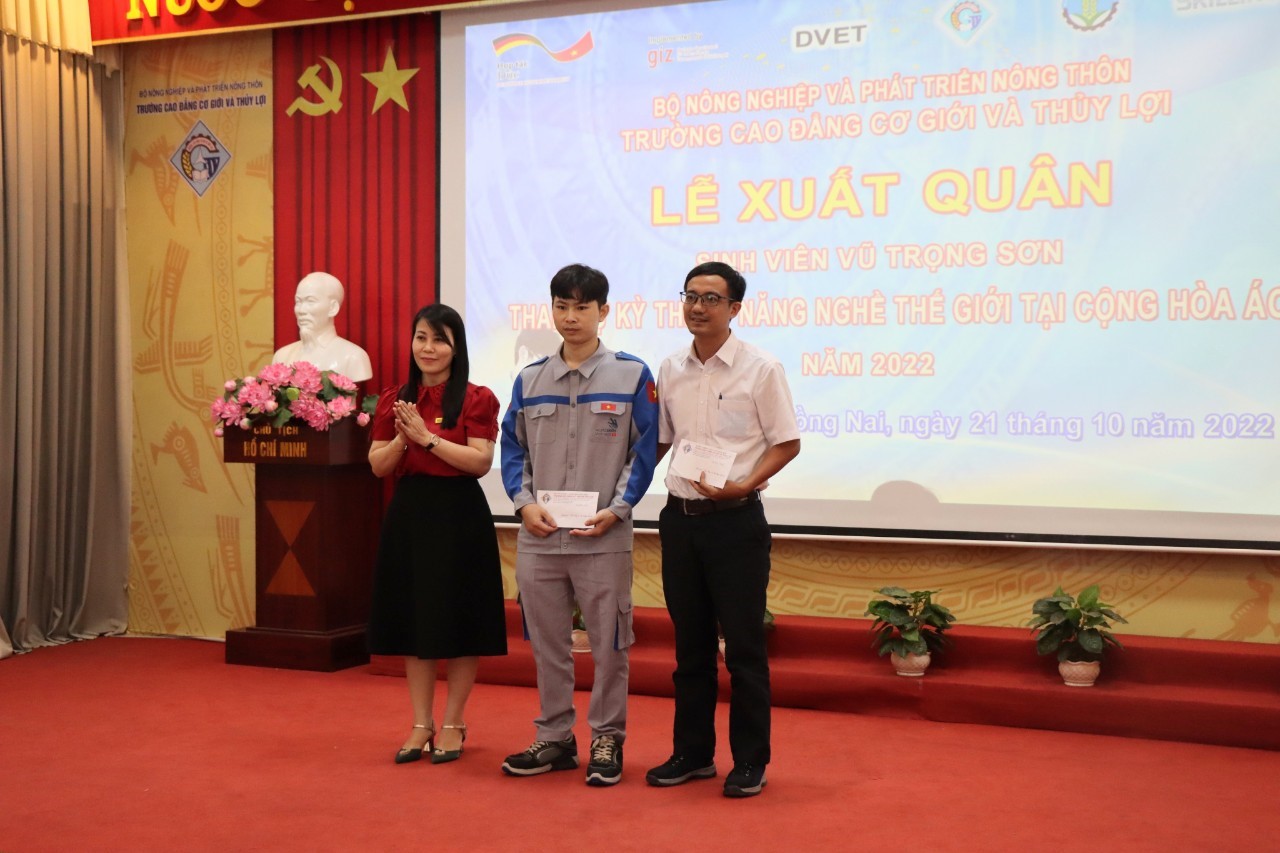Có mặt tại buổi lễ, ông Nguyễn Chí Trường, Vụ trưởng vụ kỹ năng nghề, Tổng cục giáo dục nghề nghiệp, Bộ LĐTBXH đã đọc và trao bức thư chúc mừng của Tổng cục trưởng, Tổng cục Giáo dục nghề nghiệp. Bức thư là những lời động viên tinh thần vô giá gửi đến em Sơn và các chuyên gia trong hội thi kỹ năng nghề thế giới. Phát biểu tại buổi lễ, ông Nguyễn Chí Trường đã gửi những lời chúc mừng tốt đẹp đến em Vũ Trọng Sơn. Ông trường cũng khẳng định: “Kỳ thi kỹ năng nghề thế giới là nơi hội tụ tất cả các tài năng trên thế giới đến tham gia tranh tài, là nơi hội tụ của các công nghệ, cũng là nơi các nhà hoạch định chính sách của các nước cùng có mặt”. Vì vậy hội thi sẽ có những khó khăn nhưng đồng thời cũng là cơ hội để khẳng định mình. Thay mặt cho Tổng cục Giáo dục nghề nghiệp, ông Trường đã trao bó hoa tươi thắm và phần quà gửi tặng đến em Vũ Trọng Sơn.