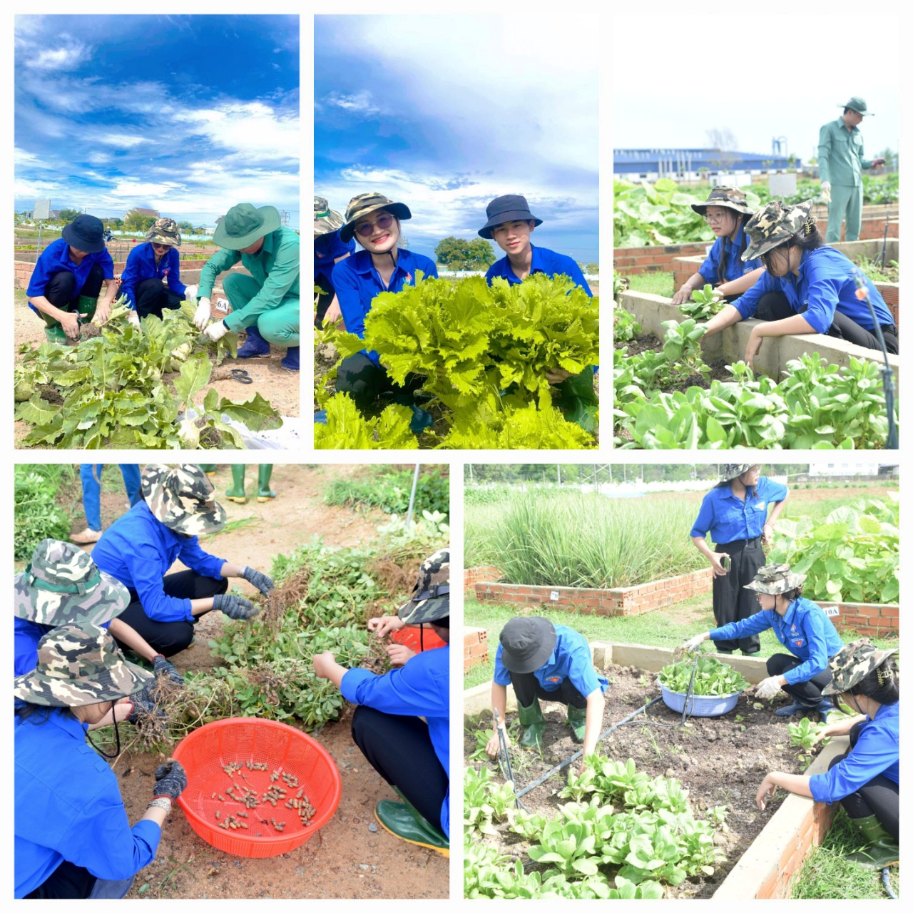 Tham gia buổi trải nghiệm, các em trong đội xung kích được thầy cô giáo hướng dẫn tham quan các mô hình nông nghiệp mà nhà trường đang áp dụng vào chương trình trải nghiệm nông nghiệp cho học sinh tại cơ sở 2 của nhà trường như khu thực nghiệm trồng nho Ninh Thuận, trồng bưởi Tân Triều, trồng báo Ninh Thuận, mô hình trồng sâm nam Núi Giành, mô hình thủy canh (nuôi cá kết hợp trồng rau bằng quy trình tự động khép kín)… Không chỉ được tham quan, các em còn được hóa thân thành một nông dân thực thụ khi được trực tiếp tham gia thu hoạch lạc, thu hoạch rau, đậu, su hào. Các em được tự tay cân rau, bó rau, dán tem để chuyển đến người tiêu dùng những nông sản sạch mang thương hiệu THPT Nguyễn Bỉnh Khiêm.