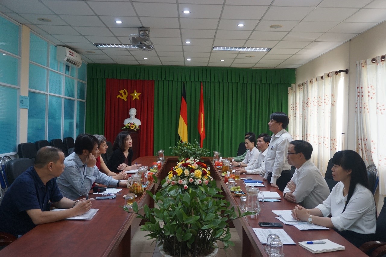Bắt đầu buổi thảo luận, TS. Nguyễn Văn Chương đã trình bày tóm tắt tiến độ thực hiện dự án, các kết quả đạt được của cả hợp phần hợp tác kỹ thuật và hợp phần hợp tác tài chính, những thuận lợi và khó khăn trong quá trình thực hiện dự án, đề nghị KfW có những hỗ trợ cần thiết cho dự án để dự án có thể thực hiện đúng tiến độ và đạt được kết quả như mong đợi. Ông Nhữ Nguyễn Hồng Cương, với vai trò của chuyên gia tư vấn về xây dựng, đã đánh giá tiến độ thi công tòa nhà trung tâm xanh vượt tiến độ thi công đặt ra; hệ thống báo cáo quản lý chất lượng công trình chi tiết, đầy đủ; thời gian báo cáo kịp thời; điều kiện an toàn, vệ sinh cho công nhân thi công trên công trường được đảm bảo.