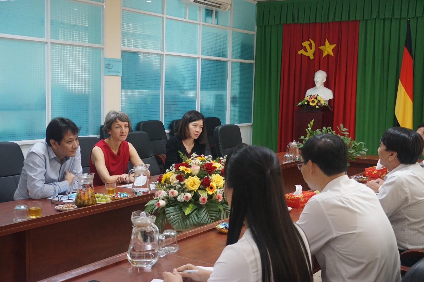 Đoàn công tác cũng thảo luận với THPT Nguyễn Bỉnh Khiêm và các bên liên quan về kế hoạch thực hiện các công việc sắp tới như tiến độ thi công tiếp theo của công trình Tòa nhà xanh, tiến độ lập danh mục thiết bị và thông số kỹ thuật chi tiết cho 2 nghề mới, kế hoạch đấu thầu sắp tới,…Các bên đã trao đổi và đưa ra các giải pháp để đẩy nhanh tiến độ thực hiện. Đại diện đoàn công tác, bà Simone Wunsch hứa sẽ hỗ trợ tích cực THPT Nguyễn Bỉnh Khiêm trong quá trình thực hiện dự án; mong muốn được tiếp tục hợp tác với THPT Nguyễn Bỉnh Khiêm trong thời gian tới không chỉ trong dự án đang triển khai mà cả những dự án tương lai sau này.