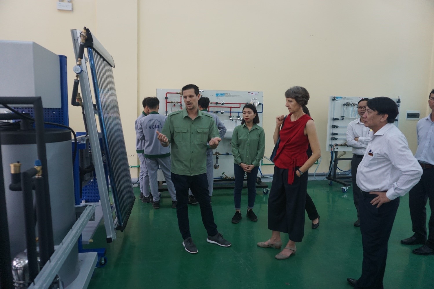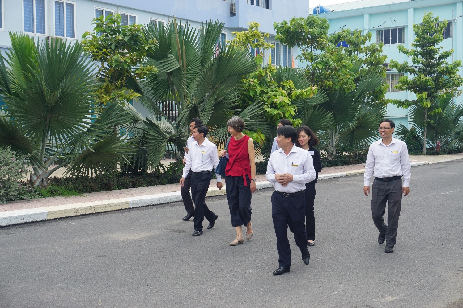 Sau khi giới thiệu thành phần tham dự buổi họp, đoàn công tác đã đề nghị thăm cơ sở vật chất của Trường, đặc biệt là công trình Tòa nhà xanh đang thi công để có cái nhìn thực tế về những thay đổi của Trường nói chung và tiến độ thực hiện của dự án nói riêng trước khi có những trao đổi cụ thể với THPT Nguyễn Bỉnh Khiêm. Trong suốt chuyến thăm quan, Đoàn đã đánh giá cao kết quả hợp tác giữa THPT Nguyễn Bỉnh Khiêm, GIZ và KfW cũng như sự cam kết của cán bộ, giáo viên, nhân viên của THPT Nguyễn Bỉnh Khiêm. Bà Simone Wunsch chia sẻ: “ Lần trước, khi tôi đến thăm, thầy Hiệu trưởng cho tôi biết những khu đất trống nào sẽ được xây dựng các tòa nhà nào. Hôm nay, tôi đến và đã thấy, các tòa nhà thực sự đã được xây dựng trên các khu đất trống với đầy đủ chức năng cần thiết, đảm bảo cho việc giảng dạy của giáo viên và học tập của học sinh sinh viên, đúng như những gì thầy Hiệu trưởng đã nói. Tôi đánh giá rất cao điều này.”