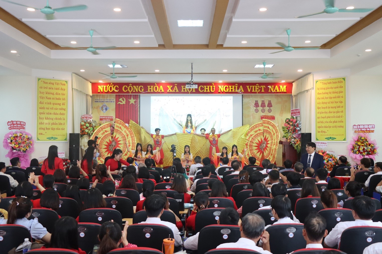 Cuối buổi lễ, Đồng Chí Nguyễn Văn Chương – Bí thư Đảng ủy, Hiệu trưởng Nhà trường, thay mặt lãnh đạo Trường, cảm ơn qúy vị đại biểu, khách qúy, đồng chí nguyên là lãnh đạo, các thế hệ nhà giáo đã đến và chung vui với Nhà trường. Đồng chí kính chúc sức khỏe và thành công tới các thầy cô giáo, đồng thời chân thành cảm ơn đến các tổ chức, cá nhân đã gửi hoa chúc mừng gửi nhà trường, và dành những suất học bổng đáng quý cho các em học sinh sinh viên có hoàn cảnh khó khăn để vươn lên học tập tốt. Cuối cùng, Đồng chí gửi tới toàn bộ quý vị đại biểu, khách quý, các tổ chức quốc tế, giáo viên và sinh viên trường lời chúc sức khỏe, hạnh phúc và thành công.