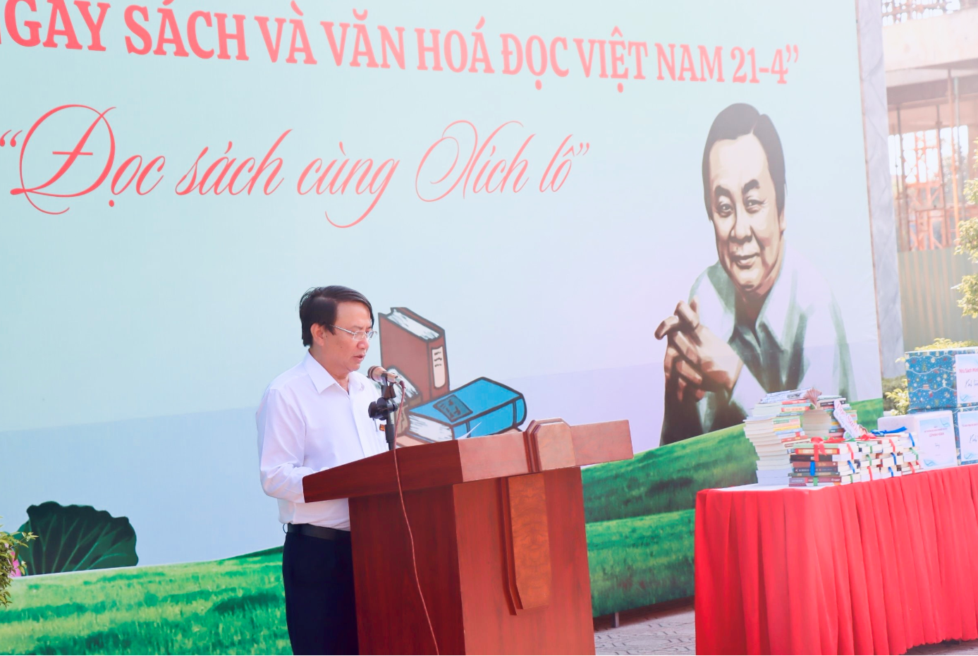 Phát biểu khai mạc, đồng chí Nguyễn Văn Chương – Bí thư Đảng uỷ, Hiệu trưởng Nhà trường nhấn mạnh: Trong đời sống của mỗi chúng ta, sách là sản phẩm văn hoá tinh thần, là kho tàng tri thức đóng vai trò quan trọng, là người thầy vĩ đại thắp sáng trong mỗi chúng ta nguồn tri thức vô tận. Sách dạy cho chúng ta cách sống, cách làm người, hướng tới những giá trị nhân văn cao cả. Dự án “Đọc sách cùng Xích Lô” là ý tưởng được sáng lập bởi Bộ trưởng Bộ Nông nghiệp và Phát triển nông thôn Lê Minh Hoan đồng thời là tác giả của nhiều bài viết về ngành nông nghiệp có bút danh Xích Lô. Từ lâu nay, dự án “Đọc sách cùng Xích Lô” đã trao tay, lan tỏa và giới thiệu rất nhiều tủ sách đáng đọc cho nhiều người ở nhiều nơi. Dự án mong muốn phát triển phong trào khuyến đọc và tinh thần học tập trong đội ngũ cán bộ, công chức, viên chức, người lao động…Việc phát triển văn hóa đọc trong nhà trường sẽ góp phần phát triển tư duy, nuôi dưỡng tinh thần hiếu học, hình thành văn hóa đọc cho cán bộ, giáo viên và các em HSSV. Phát động phong trào, đồng chí Nguyễn Văn Chương đề nghị cán bộ, giáo viên và HSSV trong toàn trường hãy tạo cho bản thân thói quen đọc sách 30 phút mỗi ngày để làm giàu kiến thức cho bản thân, để nuôi dưỡng tâm hồn và phát triển văn hoá đọc trong cộng đồng.